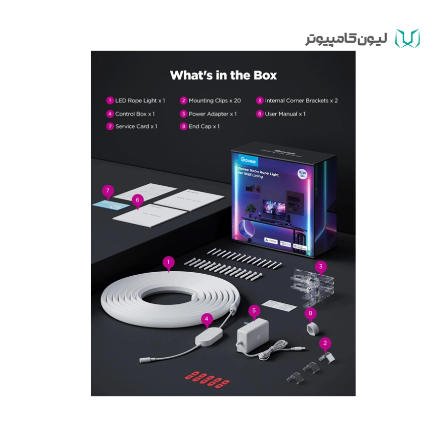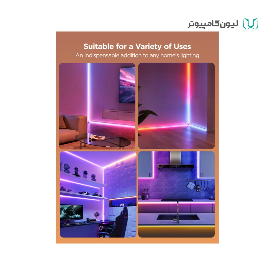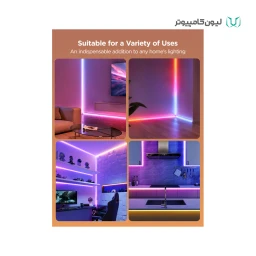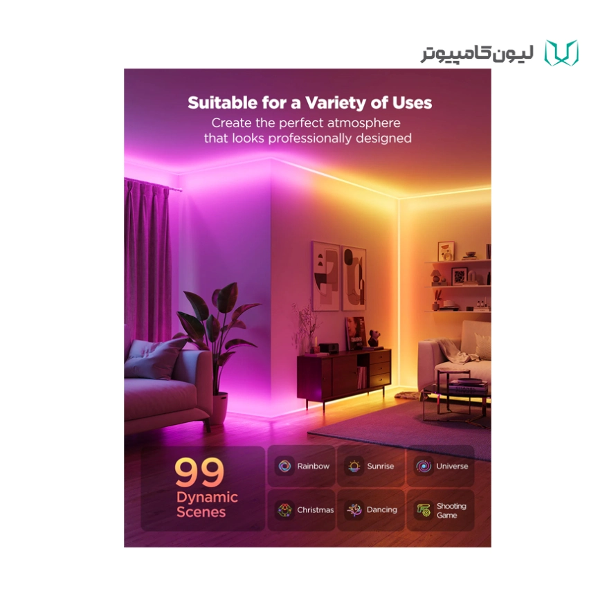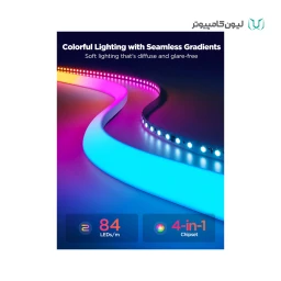 مناسب برای گوشههای اتاق و زوایای ۹۰ درجه/ نوع منبع نور: LED / تعداد منبع نور: 420 / پشتیبانی از کانال رنگ RGBIC / پشتیبانی از 99 حالت صحنه / پشتیبانی از ربات نورپردازی هوش مصنوعی / قابلیت تنظیم نورپردازی از طریق Govee Home App، Matter، Alexa یا Google Assistant