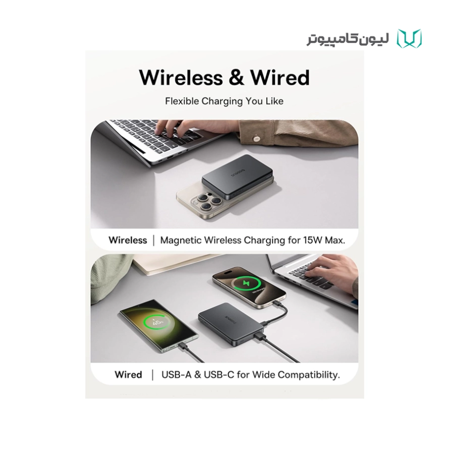پورت ورودی: USB-C / پورت های خروجی: USB-C ,USB-A و شارژ وایرلس / امکان شارژ همزمان 2 دستگاه (USB-A + USB-C)