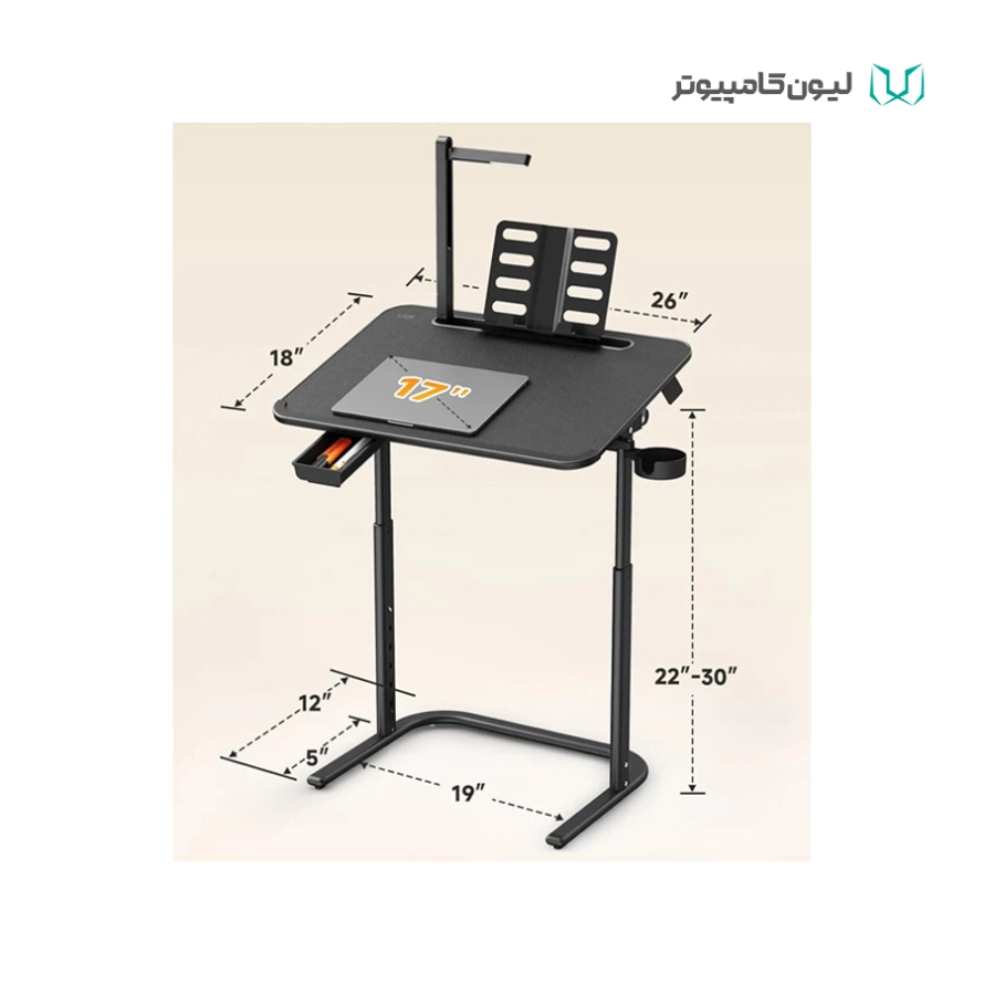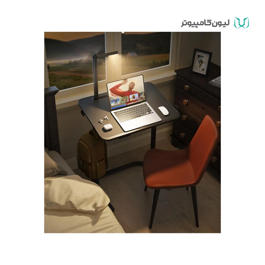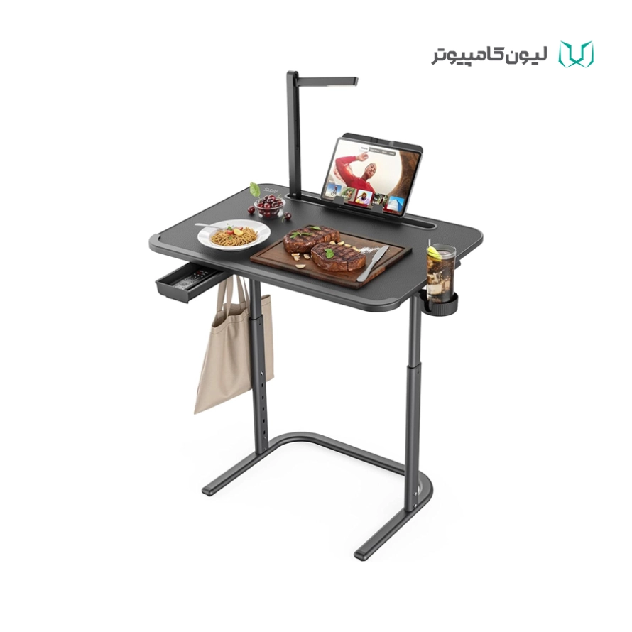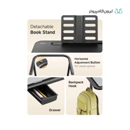 این میز شامل: قلاب کیف , کشوی توکار , جا لیوانی(قابل چرخش) , پایه کتاب و چراغ/ چراغ LED داخلی: دارای ۳ سطح روشنایی و زاویه قابل تنظیم / طراحی مدرن و ارگونومیک / قابلیت تنظیم ارتفاع و زاویه