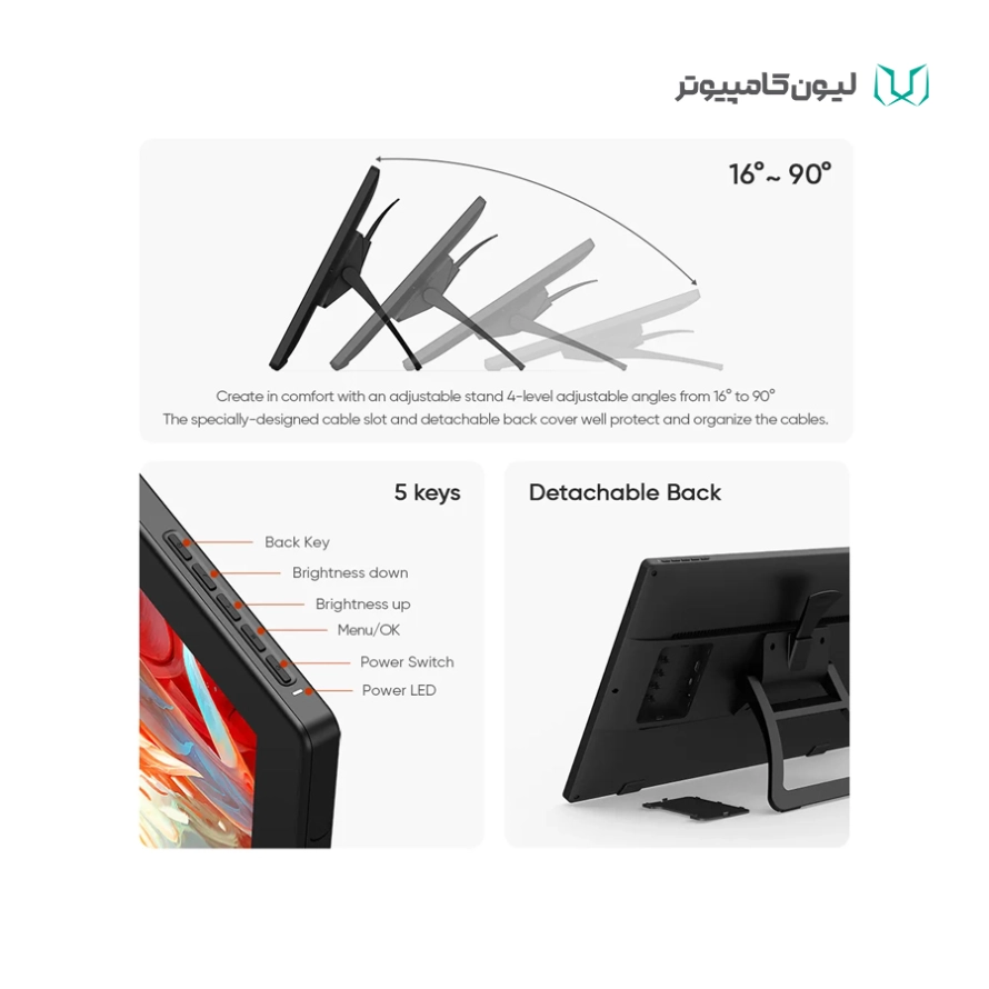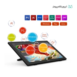 کلیدهای میانبر روی بدنه: 5 عدد /کلیدهای روی قلم: 2 عدد دکمه قابل برنامهریزی / درگاهها: 1x USB-C port ,1x HDMI port ,1 x Headphone ,1 x DC-IN / پشتیبانی از شیب (Tilt): ±60 درجه / میزان روشنایی: ۲5۰ کاندلا بر متر مربع / میزان دقت: ±0.5 (مرکز) و ±1.5 (گوشه) / وسعت رنگ: 98% Adobe RGB, 132% sRGB / ولتاژ خروجی 12 ولت 3 آمپر / گواهینامهها: FCC/CE/EAC/NOM/PSE/WEEE/RCM/KC/RoHs/BIS / سازگاری با نرمافزارهای: Adobe Photoshop, Illustrator, SAI, CDR, GIMP, Krita, MediBang, FireAlpaca, Toonboom, Maya, and Blender3D
