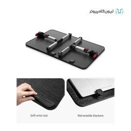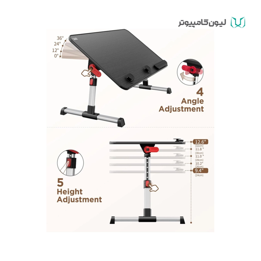 زاویه قابل تنظیم: تا ۳۶ درجه(4 زاویه مختلف) / ارتفاع پایه: تا ۳۲ سانتیمتر قابل تغییر(5 ارتفاع مختلف) / دارای گیره بازشونده (Retractable Blocker) برای جلوگیری از سر خوردن لپتاپ یا ماوس