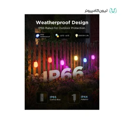نوع منبع نور: LED / دمای رنگ: 2700 کلوین / میزان روشنایی: 65 لومن / تعداد حالت های صحنه: بیش از 100 حالت / تعداد حالت های موسیقی: 10 حالت / پشتیبانی از کانال رنگ RGBICW / تعداد رنگ قابل نمایش: 16 میلیون / پشتیبانی از حالت نورپردازی DIY / سطح مقاومت در برابر آب: چراغها: IP66 , جعبه کنترل: IP65 و آداپتور: IP44 / طول عمر: تا ۲۵۰۰۰ ساعت در دمای بین ۲۰- تا ۴۰ درجه سانتیگراد / روش های کنترل: کنترل از طریق برنامه و دستیار صوتی( Google Assistant , Alexa و Matter)