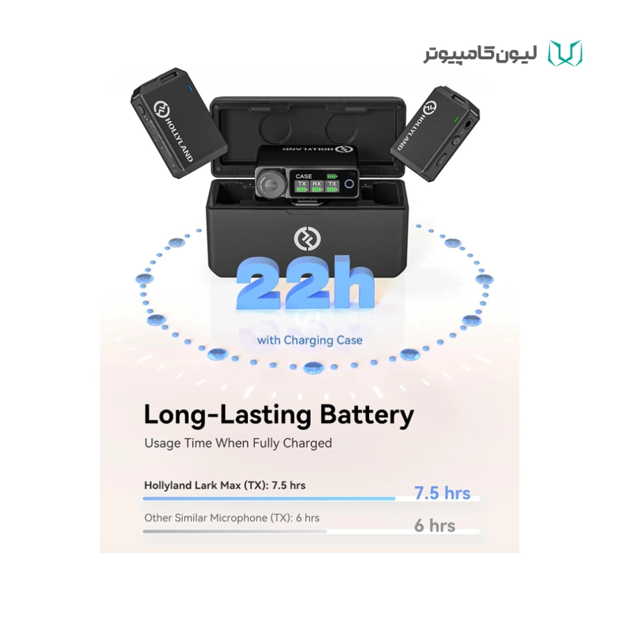 فرستنده: 7.5 ساعت (زمان کارکرد) و 14 ساعت (زمان ضبط) / گیرنده: 9 ساعت (زمان کارکرد) / کارکرد کلی کیس شارژ: تا حدود ۲۲ ساعت