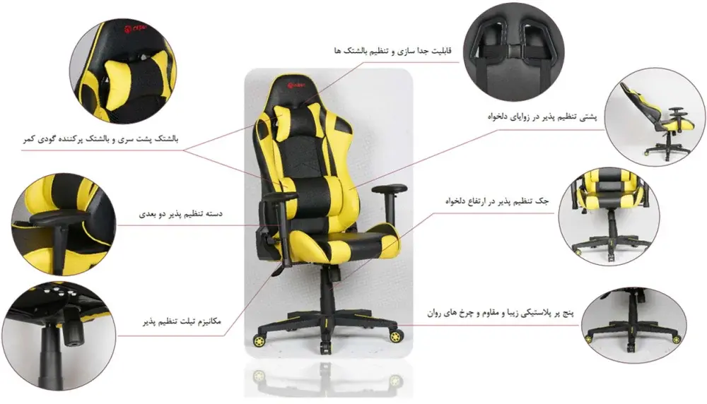 جنس دسته: پد فوم انتگرال - دارای بالشتک پشت سری و بالشتک پرکننده گودی کمر با قابلیت جداسازی - مکانیزم: تیلت
