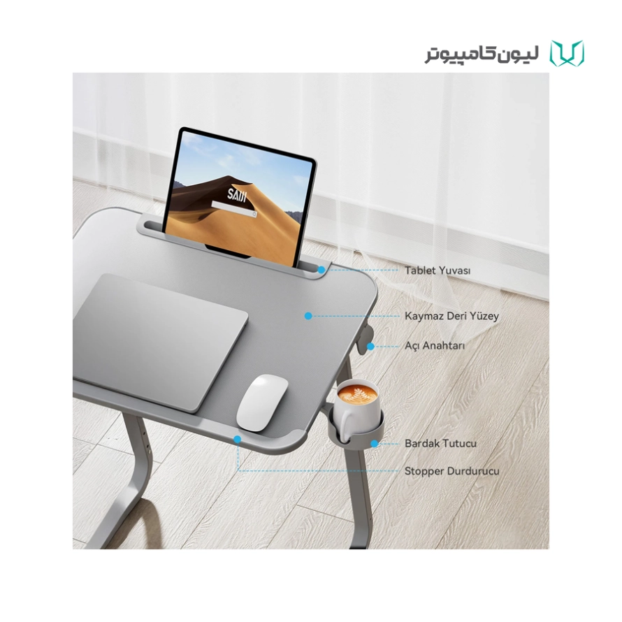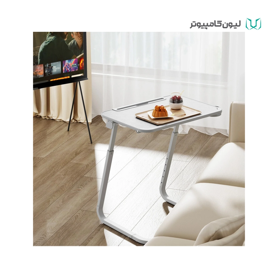 شامل جای نگهدارنده تبلت (tablet slot) و جای لیوان (cup holder) / بخش زیرین: دارای پد سیلیکونی / روکش صفحه: مقاوم در برابر لغزش، ضد آب، ضد خراش و قابل تمیز شدن / پایههای طراحیشده C-شکل