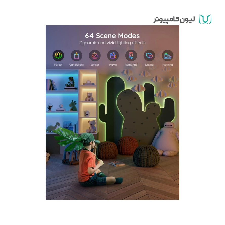 بیش از ۱۶ میلیون رنگ / نوع منبع نور: LED / پشتیبانی از کانال رنگ: RGB / توان: 12 وات / ولتاژ: 12 ولت / پشتیبانی از ۶۴ حالت از پیش تعریف شده / دارای عملکرد سفارشی DIY / قابلیت همگام سازی با موسیقی (Music Sync) با میکروفون داخلی / روش های کنترل: کنترل از طریق برنامه, جعبه کنترل و دستیار صوتی ( Google Assistant و Alexa )