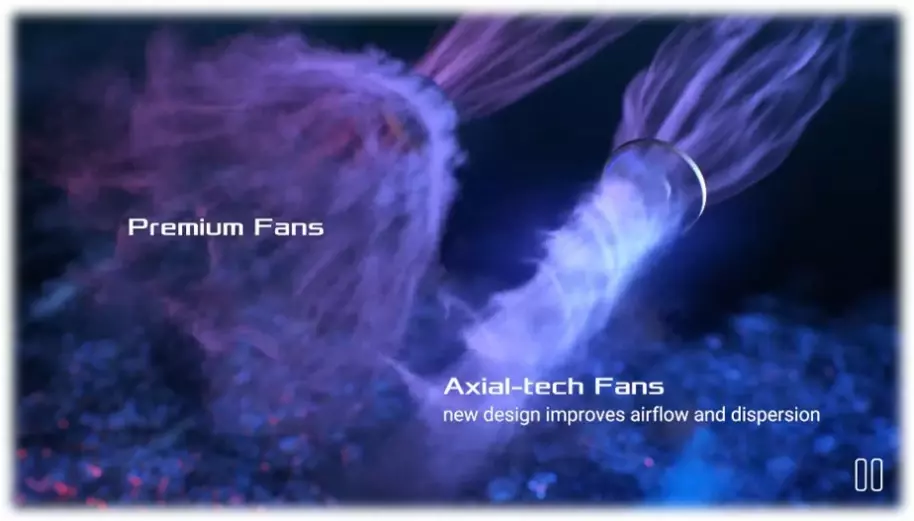 طراحی فن با به روزترین فناوری محوری (Axial): این فن که برای نسل جدید کارتهای گرافیک قدرتمند ایسوس ساخته شده دارای مرکز محور کوچکتری است که امکان بلندتر شدن پرّهها را فراهم میکند. ساختار حلقه بیرونی فن هم موجب میشود هوا با فشار بیشتری به سمت پایین حرکت کند.
