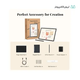 نوک یدک قلم: 4 عدد / آداپتور برق / کابل USB-C / آداپتور برق / دستکش طراحی / پارچه تمیزکننده صفحه / دفترچه راهنما