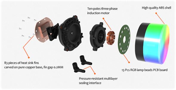 کلاهک پمپ این خنککننده، به شکل یک دایره شیشهای شفاف و جذاب طراحی شده و مجهز به لامپهای ARGB است. جلوههای نورپردازی این بخش بسیار جذاب و رنگارنگ هستند. تمامی پارامترهای نورپردازی، از طریق هدر ARGB مادربرد و یا کنترلر فیزیکی داخل بستهبندی، قابل شخصیسازی خواهند بود.